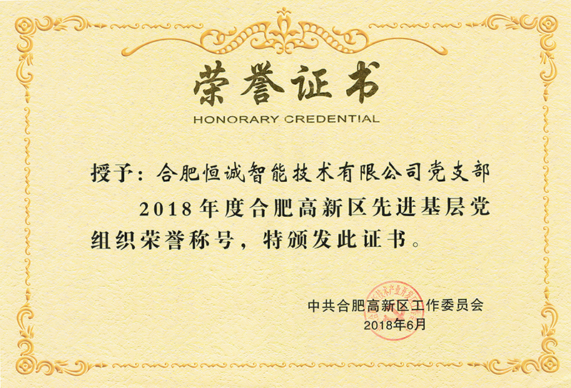 恒誠(chéng)智能黨支部榮獲“2018年度合肥高新區(qū)先進(jìn)基層黨組織”榮譽(yù)稱號(hào)