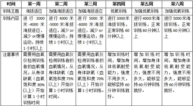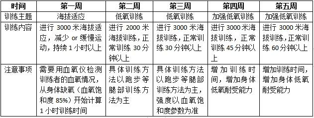 原理:在5000米訓練方法的基礎上,增加海拔和訓練強度,進而增加人體在極低氧環(huán)境下的運動能力。
